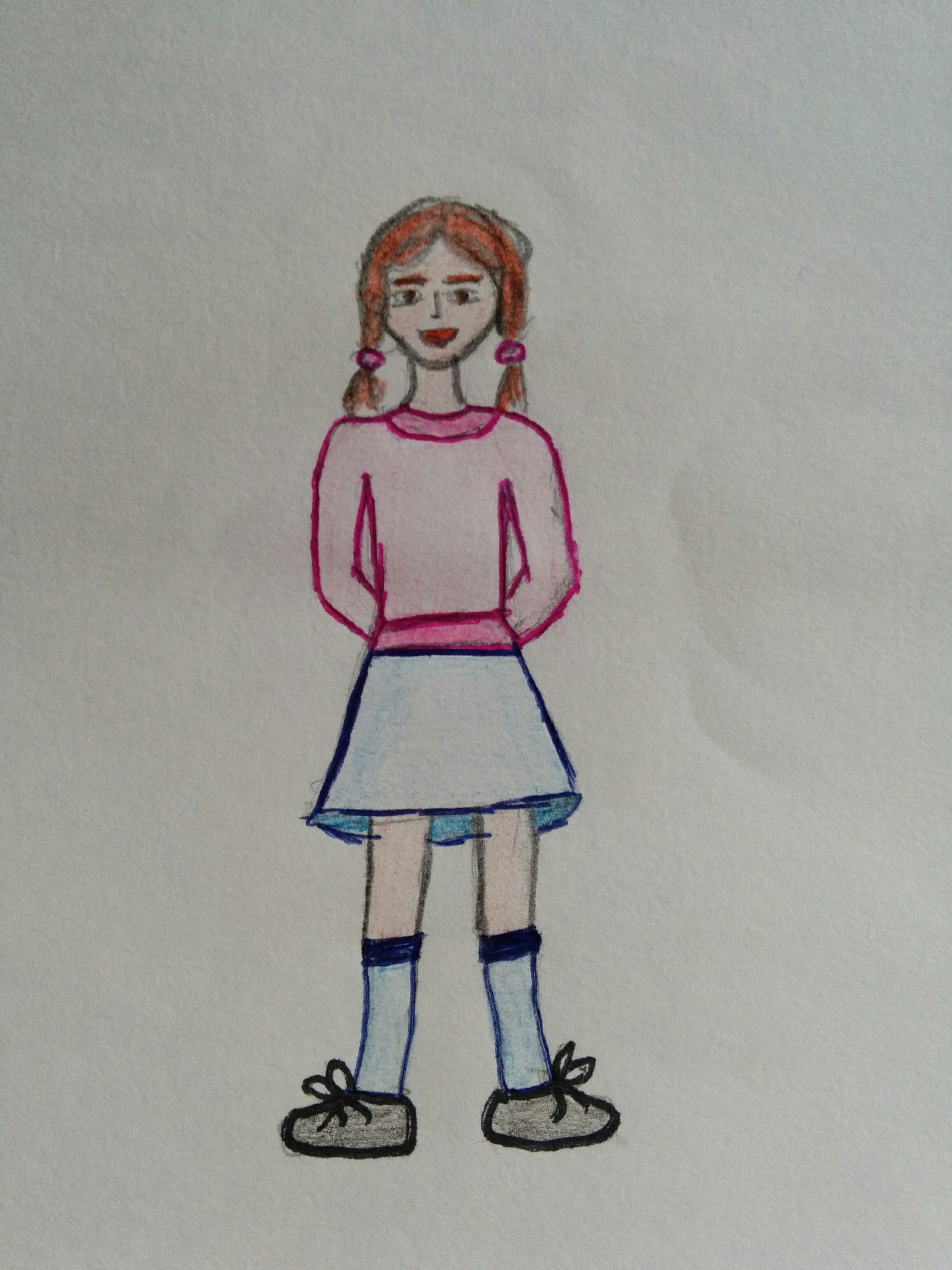 This is another younger part of me (who apparently was a big fan of knee socks and had reddish hair? Whatever), but unlike my personal demon, she is confident and does not. Give. A. Shit. About. Anything. I drew her after my mother told me, for the thousandth time, that I was a super happy, not-depressed, confident child before puberty (pro tip: contrary to what society would like you to think, getting boobs in the fourth grade does NOT lead to increased self-esteem), at which time the shit really hit the fan.