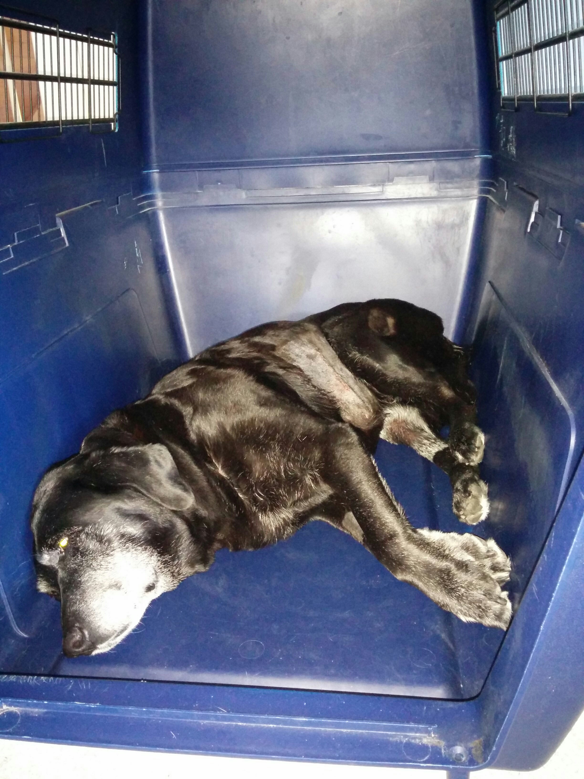 Everything turned out ok – we took Jazzy in the next morning for surgery, and they simply removed both tumors, and told us it’s likely that this will be the end of it. She was hilariously high on pain medication last night (she would be a terrible companion for a pub crawl), and is pretty exhausted today, but the vet says she could live another year or more of high-quality life if no more cancer crops up. Here she is this morning in one of her favorite spots, her crate, dozing from the pain meds – you can see her scar on her belly if you look closely, as well as the white patch on her leg from her previous bout with cancer seven years ago (yep, this literal bitch is a literal 2x cancer survivor):